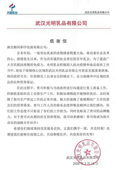 2020年年初,面對(duì)突如其來(lái)的疫情,全國(guó)上下眾志成城,齊心合力,共抗疫情。銀河人也不例外,第一時(shí)間投身到這場(chǎng)沒(méi)有硝煙的戰(zhàn)役中。各類(lèi)醫(yī)療救援物資、民生物資,通過(guò)銀河人生產(chǎn)的紙箱,送達(dá)戰(zhàn)“疫”前線(xiàn)。
